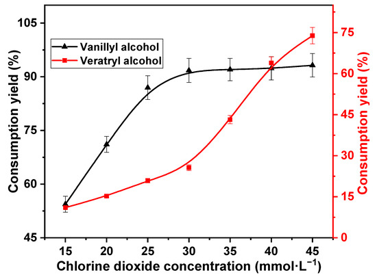 The concentration of chlorine dioxide is an important factor affecting the consumption of lignin in the reaction [32]. Therefore, variation in consumption yields of vanillyl alcohol and veratryl alcohol with respect to chlorine dioxide concentration was investigated. The reaction temperature was 60 °C, and the reaction time was 30 min; the reaction substrates were 10 mmol·L−1 vanillyl alcohol and 10 mmol·L−1 veratryl alcohol. In fact, equimolar quantities were investigated to maximize the competition between the two models with chlorine dioxide. The decomposition of chlorine dioxide is limited. The chlorine dioxide concentrations were 15, 20, 25, 30, 35, 40, and 45 mmol·L−1. The results are shown in Figure 1.