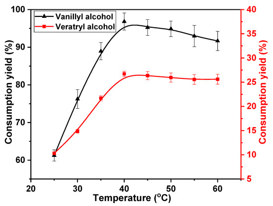 Effect of reaction temperature on vanillyl alcohol and veratryl alcohol consumption.