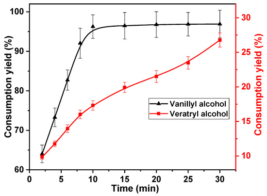 Effect of reaction time on vanillyl alcohol and veratryl alcohol consumption.