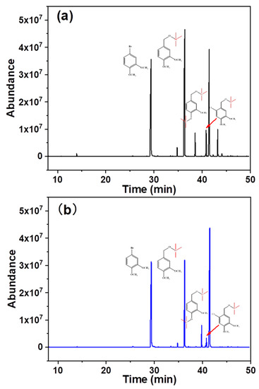 The organic components in the reaction solution were extracted using ethyl acetate. The composition of the derivatization reaction solution was analyzed using a gas chromatograph (7890B GC/5977A, Agilent Technologies, Santa Clara, CA, USA). The injection volume was 1 μL. An HP-5MS column with dimensions of 30 m × 250 μm × 0.25 μm was used. The flow rate was 1 mL·min−1. The injection port temperature was 250 °C. The temperature of the MSD ion source was maintained at 230 °C. The MS quadrupole temperature was set to 150 °C. The MSD transmission-line temperature was set to 280 °C. The specific operations and procedures are described in a previous paper [45].