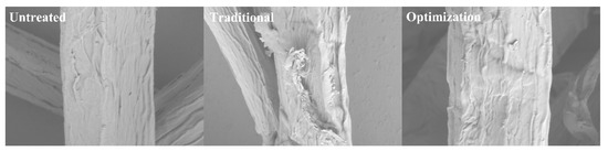 In addition to the differential oxidation of the aforementioned model substances possessing different consumption rates, the composition of the oxidation products was altered. Figure 4 shows the composition of the different hydrolysates. Specific component attributes and their contents are listed in Table 1. 3,4-Dimethoxybromobenzene, veratryl alcohol, vanillyl alcohol, and 6-chloro-veratryl alcohol were detected during the traditional chlorine dioxide oxidation, and their retention times were 29.50, 36.39, 38.53, and 41.46 min, respectively. 3,4-Dimethoxybromobenzene was used as the internal standard. The changes in the contents of other components were analyzed before and after oxidation. The relative contents of vanillyl alcohol and veratryl alcohol were 0.11 and 0.56, respectively. This suggests that the depletion of phenolic and non-phenolic lignin structures is not selective during traditional chlorine dioxide oxidation treatment. However, the relative content of veratryl alcohol increased to 0.96, while the relative content of vanillyl alcohol remained constant under the optimized chlorine dioxide oxidation conditions. The non-phenolic structure was protected by the modulation of the chlorine dioxide oxidation treatment. Furthermore, 6-chloro-veratryl alcohol, the relative content of one of the main products in the hydrolysate, traditional chlorine dioxide oxidation and optimized chlorine dioxide oxidation, were 0.53 and 0.30, respectively. 6-Chloro-veratryl alcohol (chlorobenzene) is derived from the chlorination of veratryl alcohol with chlorine dioxide [35], owing to the generation of chlorine gas and hypochlorite during the chlorine dioxide oxidation of lignin. The chlorinated replacement of the lignin benzene ring occurred. This is the key to the generation of organic pollutants during the chlorine dioxide oxidation of pulp [36]. Thus, the efficient and clean oxidation of chlorine dioxide was impeded. The chlorination reaction was effectively suppressed by modulating the oxidation of phenolic and non-phenolic structures with chlorine dioxide. The results showed that in the non-phenolic lignin model, veratryl alcohol was effectively retained under the optimized chlorine dioxide oxidation conditions. Additionally, the insufficient chlorination of the non-phenolic structure was prevented. The structure of lignin is one of the main factors affecting the compact structure of wood fibers. Therefore, the effect of this novel chlorine dioxide oxidation treatment on the physicochemical properties of pulp fibers was analyzed.