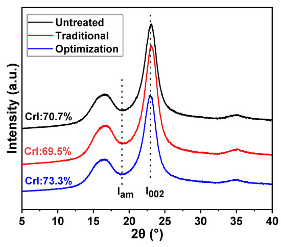 The CrI values of the different eucalyptus pulps are presented in Figure 6. The CrI of the pulp was reduced from 70.7% to 69.5% after traditional chlorine dioxide oxidation. This is due to the depolymerization of cellulose, accompanied by the oxidative removal of lignin under traditional chlorine dioxide oxidation conditions. The changes in the crystalline and non-crystalline zones were offset. However, the CrI of the pulp after the optimization of chlorine dioxide oxidation was high at 73.3%. This implies that the insufficient depolymerization of cellulose was suppressed by optimizing the chlorine dioxide oxidation treatment to achieve selective oxidative degradation of the lignin structure.