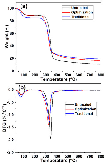The maximum weight loss temperature of the slurry changed after different chlorine dioxide treatments. It decreased from 278 to 261 °C under the traditional chlorine dioxide oxidation conditions (Figure 7a), owing to the acidic degradation of cellulose during the bulk removal of lignin [40]. Consequently, a reduction in the maximum weight loss, from 67% to 53%, was observed. The maximum weight loss temperature of the pulp after the optimization of chlorine dioxide oxidation was close to that of the untreated pulp. This indicates that the cellulose structure was protected during the selective oxidative removal of lignin with a maximum weight loss of 58%. Additionally, the pyrolysis residues of the three samples, untreated, optimized, and traditional, were 11%, 17%, and 19%, respectively. This indicated that the untreated pulp had the lowest relative lignin content. A part of the lignin structure was retained during the optimization of the chlorine dioxide oxidation process. Therefore, its pyrolytic residue content was higher than that of the pulp after traditional chlorine dioxide oxidation. Figure 7b shows that the temperature at which maximum weight loss occurred decreased after multiple chlorine dioxide oxidations. This is because the structure of the cellulose is partially destroyed due to the acidic chlorine dioxide environment. However, the maximum weight loss temperature of 333 °C for the optimized chlorine dioxide oxidized pulp was higher than the maximum weight loss temperature of 326 °C for the traditional chlorine dioxide oxidized pulp. The results indicate that the structural strength of cellulose is enhanced by the retention of part of the lignin structure after the optimized chlorine dioxide oxidation treatment.