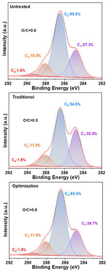 The distribution of elements on the fiber surface was altered by the component content. Figure 8 shows that the C1, C2, C3, and C4 contents of the untreated pulp are 27.3%, 60.3%, 10.5%, and 1.9%, respectively. This indicated that the untreated pulp rich in cellulose contained a small amount of lignin. Moreover, it has an O/C ratio of 0.6. The C1 content of the traditional chlorine dioxide oxidized pulp increased to 33.5% compared to that of the untreated pulp (27.3%). Therefore, the highly efficient oxidation treatment of lignin by chlorine dioxide has been demonstrated [41]. However, the C2 content was reduced from 60.3% to 54.0%, indicating that the degradation of cellulose was insufficient. This resulted in a reduction in the O/C ratio from 0.6 to 0.5. The C1 content of the optimized chlorine dioxide oxidized pulp was reduced to 24.7% compared to that of the traditional chlorine dioxide oxidized pulp (33.5%), whereas the C2 content increased from 54.0% to 62.4%. In comparison, the untreated slurry displayed a C2 content of 60.3%. A maximum O/C ratio of 0.6 was obtained, owing to the partial removal of lignin via the optimized chlorine dioxide oxidation treatment. Next, the structural transformation of lignin in the pulp was analyzed.