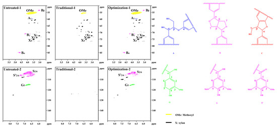 The structure of lignin in the pulp before and after oxidation with different chlorine dioxide concentrations was analyzed using 2D-HSQC NMR (Advance III HD 500 MHz, Bruker BioSpin AG, Faellanden, Switzerland) [2,46]. In fact, lignin in pulp before and after chlorine dioxide oxidation was extracted using the milled wood lignin (MWL) method [47]. However, the difficulty of lignin extraction was increased due to the low lignin content in the pulp after chlorine dioxide oxidation treatment. Fortunately, lignin of sufficient content and structural integrity was extracted by MWL treatment of large quantities of pulp. The extraction yield of lignin was 48.4%. The structural integrity of lignin is a hypothesis.