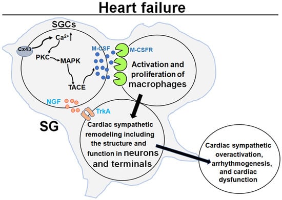 As mentioned above, satellite glial cells exist ubiquitously in peripheral ganglia, including sympathetic, parasympathetic, and sensory ganglia. In addition to the local production of NGF by satellite glial cells in stellate ganglia, satellite glial cell–macrophage communication could be another mechanism responsible for the remodeling of cardiac postganglionic sympathetic neurons in HF. One recent study demonstrated that acute or chronic intestinal inflammation activates enteric glial cells to release macrophage colony-stimulating factor (M-CSF) through the connexin-43 hemichannel-cytosolic PKC-MAPK-cell membrane TNFα-converting enzyme (TACE) signaling pathway []. M-CSF is a key factor for the regulation of macrophage survival, proliferation, migration, and activation through binding with M-CSF receptors on the macrophage membrane [,]. Chronic inflammation, with activation of both cytokines and immune cells (such as macrophages), is a major feature of HF [,,]. Macrophages play a key role in mediating inflammatory responses in the post-myocardial infarction heart [,]. Our recent study already found that elevation of cytokines and macrophages in stellate ganglia is involved in cardiac sympathetic overactivation and ventricular arrhythmogenesis in HF []. Growing evidence suggests that inflammation-raised cytokines increase the expression and activation of cyclin-dependent kinase 5 (CDK5, a proline-directed serine/threonine kinase) in some tissues and cell lines [,,]. CDK5 can phosphorylate the N-type calcium channels and the latter induce cardiac sympathetic overactivation and ventricular arrhythmias in HF [,,]. Therefore, further understanding of the relations among satellite glial cells, macrophages, and cardiac postganglionic sympathetic neurons in stellate ganglia can provide therapeutic targets against cardiac sympathetic overactivation and malignant ventricular arrhythmias in HF.