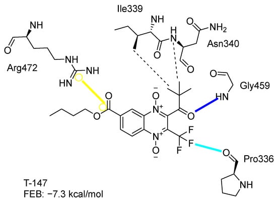 The most recurring predicted interactions for n-butyl-quinoxaline-7-carboxylate 1,4-di-N-oxide derivatives were with active site residues, Val-59, Ile107, Ile339, Phe-396, Leu-399, His-461, and Glu-466. Similarly, isobutyl quinoxaline-7-carboxylate 1,4-di-N-oxide derivatives had recurring predicted interactions with Ile-339, Asn-340, Phe-369, His-461, and Glu-466. The residues Leu-399 and Phe-396 are part of the denominated Z-site (subsite within the interphase catalytic site) reported to participate in the binding of the hydrophobic part of chlorpromazine, a known TR inhibitor; likewise, the interactions with Glu-466 and His-461 are considered important to the binding of the natural ligand [,]. According to the interaction profile of trypanothione disulfide, it can be predicted that both n-butyl and isobutyl quinoxaline derivatives may behave as TR inhibitors. Figure 2 shows the interaction profile predicted for the new quinoxaline-1,4-di-N-oxide derivative that behaves as a TR inhibitor. No predicted interactions are shared with the natural ligand, which is congruent with the mixed-inhibitory activity found.