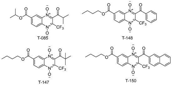 Three (T-147, T-148, and T-150) n-butyl derivatives bearing a trifluoromethyl group were selected (Figure 3) to test their capacity to inhibit TR. These compounds showed a high mortality percentage and structural similarity to the known quinoxaline-derived TR inhibitor, T-085 [].