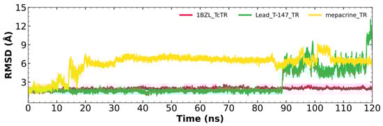 A molecular dynamics analysis was performed for the compound that behaved as the TR inhibitor, T-147, and the known TR inhibitor, mepacrine. The dynamics were analyzed with three measurements: root-mean-square differentiation (RMSD), root-mean-square fluctuation (RMSF), and radius of gyration.