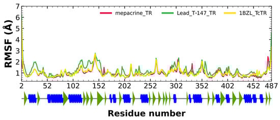 RMSF fluctuations for the complexes, T-147-TcTR (green), mepacrine-TcTR (red), and free TcTR (yellow), are shown in Figure 6. The fluctuations have only minor differences with respect to the apoprotein, suggesting stable binding without affecting residues outside the active site.