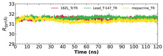 The radius of gyration graph for molecular dynamics over time for mepacrine-TcTR (yellow) and T-147-TcTR (green) complexes, and apo-TcTR (red).