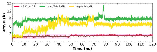 Figure 8 shows the RMSD fluctuations for the T-147-hGR (green) and mepacrine-hGR (yellow) complexes, and free hGR (red). The mepacrine-hGR complex showed a maximum fluctuation of 11.3 Å and fluctuations in the range of 4–7 Å with a mean of 6.11 ± 1.75 Å. While, the T-147-hGR complex showed a maximum fluctuation of 14.31 Å, which can be observed at 78 ns. Most of the dynamics remained stable at about 9 Å. The overall fluctuation had a mean of 8.62 ± 0.88 Å.
