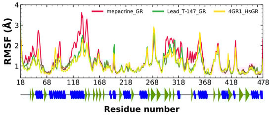 RMSF graph for fluctuations over time for mepacrine-hGR, T-147-hGR complexes, and apo-hGR, blue spiral (alpha helix), green triangle (beta sheet), in between space (loop).