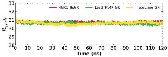Figure 10 shows the radius of gyration for the mepacrine-hGR and T-147-hGR complexes, and apo-hGR. This graph shows a mean radius of gyration between 30.5 and 31.5 Å.