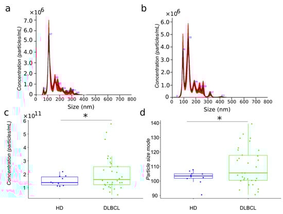 Biophysical characterization by nanoparticle tracking analysis of plasma EV samples from HD and DLBCL groups. Particle size distribution in representative samples of HD and DLBCL groups ((a,b), respectively). Distribution of estimated particle concentration and particle size mode between DLBCL patients and HDs ((c,d), respectively). * means significance.