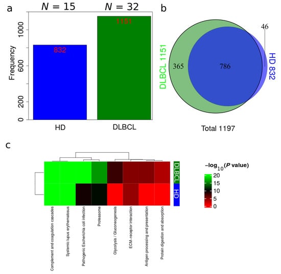 Overview of identifications in DLBCL patients and HDs. (a) Total number of identifications from DLBCL patients and HDs. (b) Venn diagram comparing identifications in DLBCL patients and HDs. (c) Summary of functional KEGG pathway analysis that are either enriched in HDs or DLBCL patients based on all identified proteins from DLBCL and HD groups.