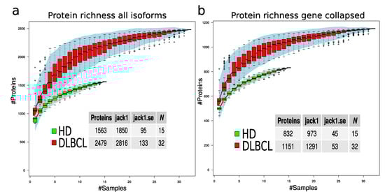 To evaluate if the protein richness is indeed higher in the DLBCL group, a subsampling of 100 permutations was drawn, assuming a different number of samples. The total number of non-redundant proteins for each sample number was counted, and standard error was calculated for each draw (Figure 4). This modeling provides a view of protein richness given the measurement strategy in the two sample groups. The estimated protein richness at the plateau by Jack1 method was 973 (45), and it was 1291 (53) for the HD and DLBCL groups, respectively (Figure 4b, gene collapsed proteins).