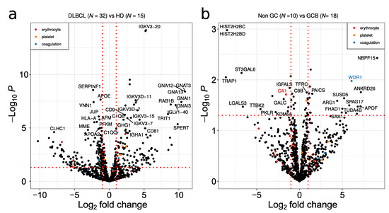 Volcano plot depicting deregulated proteins when comparing (a) DLBCL versus HD and (b) non-GCB versus GCB. A p-value threshold of 0.05 is indicated by a horizontal red dotted line. The log2 fold up or down regulation is represented by the red vertical line. Potential contaminants from erythrocyte, platelet and coagulation are indicated by red, orange and blue dots, respectively.