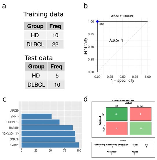 A partial least square (PLS) regression model was built, given the large number of significantly regulated proteins when comparing DLBCL and HD cases. A 66% split, ensuring a balanced training set, was applied to divide the data into training and test sets (Figure 7a). The PLS model tested on the test data displayed excellent performance based on receiving operating characteristics (ROC), with an area under the curve (AUC) of 1 (Figure 7b). The confusion matrix revealed zero misclassifications out of 15 cases (Figure 7d). The model was also built without enforcing a balanced training set, which again resulted in perfect classification without any misclassifications. Caution must, however, be highlighted due to the low number of test samples available. For a larger test set, some errors would be expected. However, given the large proteome differences between EVs from DLBCL patients and HD, we expect that this classification based on the plasma EV proteome will present high accuracy in practice. The most important protein features for the model are represented in Figure 7c. Immunoglobulin proteins appeared with the highest importance score for the model closely followed by G protein GNAI3. This model is highlighted as a proof of concept to demonstrate the feasibility of classifications based on plasma EVs. However, it must be optimized on a larger dataset, which may change the optimal proteins and classification algorithm.