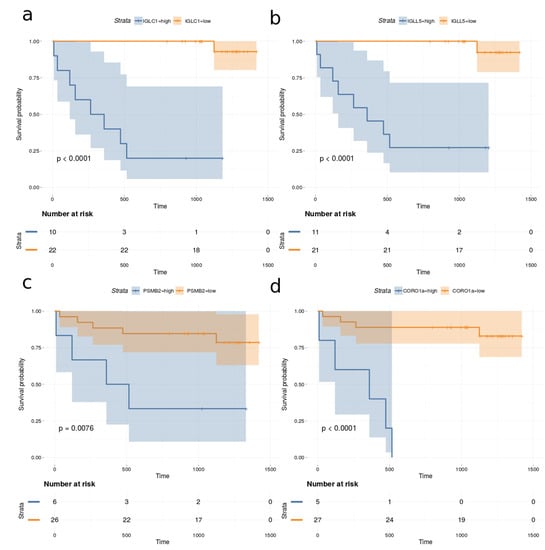 Kaplan–Meier plots based on dividing high and low expression of (a) IGLC1, (b) IGLL5, (c) PSMB2 and (d) CORO1a.