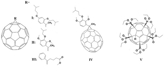 The molecular structures of fullerene derivatives that do not contain polar groups (I–V) are shown in Figure 1.