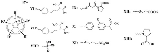 Another picture was observed for fullerene derivatives containing polar groups. The molecular structures of fullerene derivatives containing polar groups are shown in Figure 2.