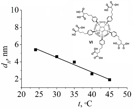 Temperature dependence of the hydrodynamic diameter dH characterizing the association of the fullerene derivative VI in DMSO/D2O (3:1 m/m) solution. The concentration of VI was 8 mg/mL.