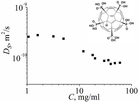 The most direct way to estimate the size of aggregates in solutions from diffusion coefficients is using the Stokes–Einstein model. Diffusion NMR spectroscopy is informative for measuring molecular diffusion parameters [37,38]. For example, in [39,40,41,42], the 1H DOSY NMR method was used to study supramolecular systems based on fullerenes. This method made it possible to obtain information about the processes of formation of supramolecular systems by analyzing the self-diffusion coefficients of the initial compounds and finished complexes. It was shown that the mobility of supramolecular systems is lower than the mobility of the initial molecules. In paper [43], the 1H DOSY NMR method was used to establish the formation of fullerene polyesters, which was also confirmed by a decrease in the diffusion coefficient.