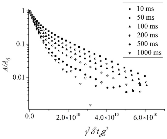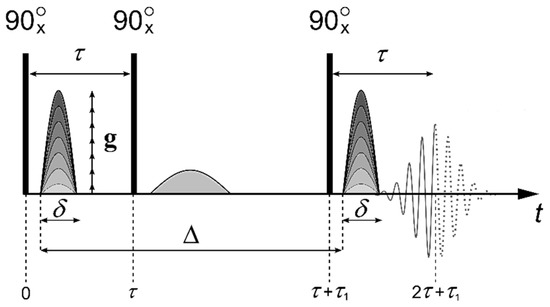 where A(0) is the signal intensity after the first radio frequency (RF) pulse (Figure 12). T1 and T2 are the spin-lattice and spin-spin relaxation times, respectively. While measuring the echo signal evolution, τ and τ1 are fixed, and only the dependence of A as a function of g is analyzed, which is called the diffusion decay.