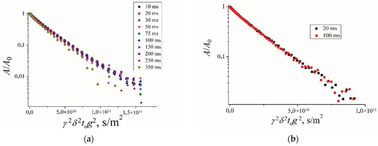 For the molecules undergoing unhindered isotropic Brownian motion, the evolution of the spin echo signal is described by the following Equation (3):