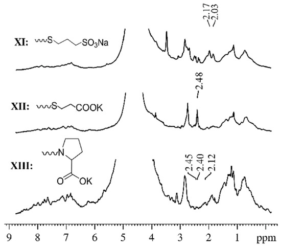 We have previously performed a detailed study of the translational mobility of compound XI in various biological systems: liposomes, shadows, and erythrocytes [53]. In this work, analysis of the high-resolution NMR spectra of the following systems was conducted: an aqueous solution of compound XI; RBCs suspension; suspensions of RBCs, RBCs shadows, and liposomes with the addition of compound XI. Using the analysis of 1H spectra at different amplitudes of the magnetic field gradient, we showed that the signals from the protons of compound XI could be uniquely identified in the spectra of suspensions. These signals do not overlap with the proton signals of the membrane components. It was also shown that, at a high amplitude of the magnetic field gradient, in the spectra of 1H suspension of RBCs with added compound XI, a signal of WSFD molecules was well observed. At the same time, proton signals of compound XI molecules are absent in an aqueous solution under the same experimental conditions. A similar picture was obtained for compounds XII and XIII. Figure 10 shows examples of the 1H spectra of the systems under study (erythrocyte suspensions with added compounds XI–XIII). 1H chemical shifts of compounds are slightly changing in suspensions of RBCs compared to solutions due to fullerene derivative interaction with RBCs.