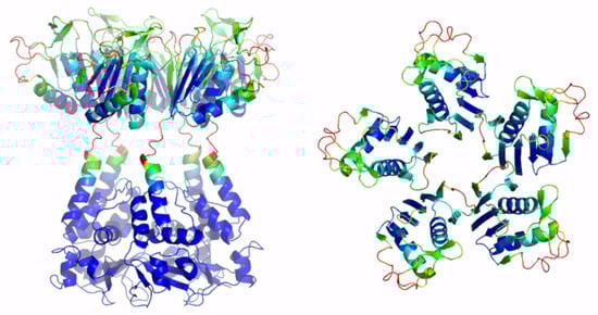 - Jumper, J.; Evans, R.; Pritzel, A.; Green, T.; Figurnov, M.; Ronneberger, O.; Tunyasuvunakool, K.; Bates, R.; Zidek, A.; Potapenko, A.; et al. Highly accurate protein structure prediction with AlphaFold. Nature 2021, 596, 583–589. [Google Scholar] [CrossRef] [PubMed]