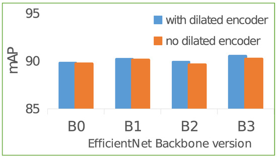 ‘BN’ denotes that the backbone network used is EfficientNet-BN. We perform a thorough experimental analysis on the TE-YOLOF examining whether the dilated encoder can help in the blood cell detection on the blood cell detection BCCD dataset. This figure shows the performance comparison of the model on mAP with or without the dilated encoder module when replacing different backbones of TE-YOLOF. The metric of mAP represents that the mean Average Precision of each category with the Intersection Over Union (IoU) threshold of 0.5.