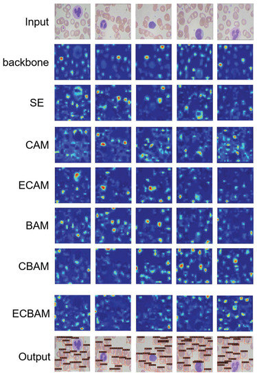 Attention map results on BCCD test set. Top to bottom: input images; the attention maps generated after backbone; the visualization results after the selected attention mechanisms, such as SE, and CAM in CBAM, ECAM, BAM, CBAM, ECBAM, and so on; the detection results of input images. The visualization is calculated after the selected module.