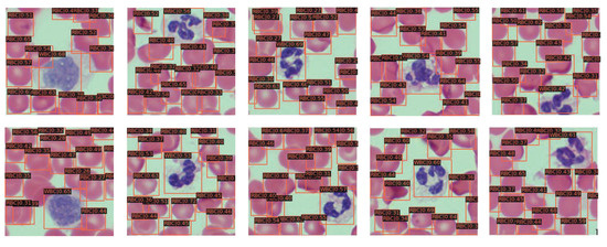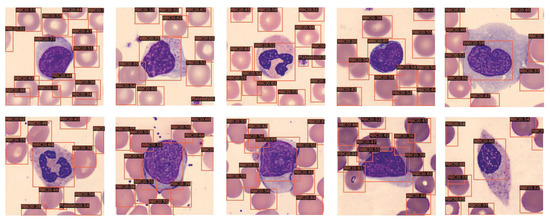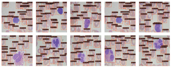 The BCCD dataset https://public.roboflow.com/object-detection/bccd (accessed on 26 July 2021), which includes 364 images, is used to conduct the blood cell detection task, which contains three cell objects: platelets, white blood cells (WBC), and red blood cells (RBC). All the images in this dataset are , after being resized from the original dimensions of . The division protocol of this dataset divided images into training, val, and test sets at a ratio of 7:2:1. In addition, data augmentation strategies such as horizontal flip and vertical flip are used to expand the diversity of images. In order to prove that our network can achieve cross-domain blood cell detection, the BCDD dataset https://github.com/draaslan/blood-cell-detection-dataset (accessed on 16 October 2021) and the WBC Image Dataset (WID) https://github.com/zxaoyou/segmentation_WBC (accessed on 18 October 2021) are used for generalization verification. All datasets are annotated in COCO format.