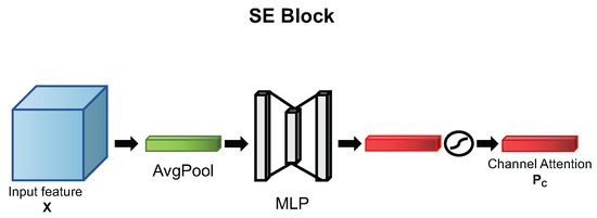 Squeeze-and-Excitation block is a powerful lightweight attention mechanism that focuses on enhancing the representation of the network by modeling channelwise relationships in a computationally efficient manner. This module is an efficient way to map input features to output features that embed the channel attention information. The transformation from X to O can be seen as the learned set of filter kernels, using to denote these filters, while refers to the parameters of the c-th filter. Then, we can write the output feature maps as , where . Here, is generally a scalar, and is an input feature map where . The ∗ denotes scalar multiplication.