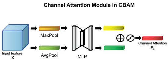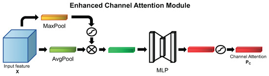 where denotes the sigmoid function, and , and is the ReLU activation function. According to the difference between Equations (2) and (4), with the visual diagram of attention mechanisms in Figure 6 and Figure 7, it is obvious that the global max pooling method is one effective trick to enhance feature aggregation. In addition to using the global max pooling method like the usage of global average pooling method, what about using the global max pooling method to enhance the features obtained by global average pooling method? This motivated us to design a new channel attention mechanism named Enhanced Channel Attention Mechanism (ECAM), see the section below for details.