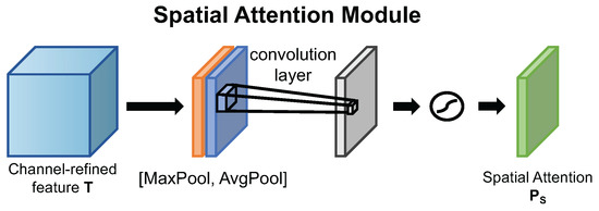 Motivated by CBAM and the fact that the channel attention can be serially combined with the spatial attention mechanism, we adopt the same architecture as CBAM and replace the channel attention mechanism in CBAM with our Enhanced Channel Attention Mechanism so as to form the new Enhanced-CBAM attention mechanism. The detailed spatial attention mechanism used in CBAM can be seen in Figure 9. We define the feature maps refined by the channel attention mechanism as , which is the abbreviation of temporary feature maps. We describe the detailed operation of the spatial attention below.