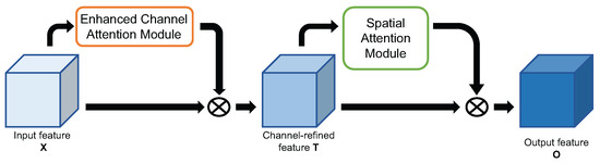 The above context is the introduction of the method of spatial attention mechanism we used; then, we give a brief introduction to the channel attention mechanism and spatial attention mechanism in a sequential manner, which we named Enhanced-CBAM (ECBAM). The overall architecture of ECBAM can be seen in Figure 10.