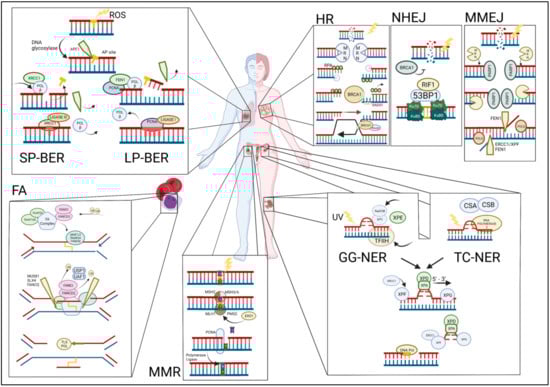 Overview of the DNA damage repair pathways and their commonly associated cancers (clockwise). TOP LEFT: Single-stranded breaks are repaired via either short-patch base excision repair (SP-BER) or long-patch BER (LP-BER). BER begins when the DNA base is damaged and is excised by the enzyme apurinic/apyrimidinic endodeoxyribonuclease 1 (APE1) and further processed by either SP-BER or LP-BER. Polymorphisms in BER pathway genes have been linked to an increased risk for the development of lung and other cancers. TOP RIGHT: Double-stranded breaks (DSBs) are repaired via homologous recombination (HR), non-homologous end joining (NHEJ), or microhomology-mediated end joining (MMEJ). HR: the MRE11-RAD50-NBS1 (MRN) complex detects double-stranded breaks. NHEJ: the Ku70/80 heterodimer detects and binds to the DSBs. MMEJ: the protein-coding gene poly (ADP-Ribose) polymerase 1 (PARP1) detects DSB mutations in HR pathway genes that are frequently associated with breast and other cancers. BOTTOM RIGHT: Nucleotide excision repair (NER) pathway is activated upon the detection of bulky DNA lesions and starts off as either a global genome NER (GG-NER) or a transcription-coupled NER (TC-NER). Mutations in TC-NER proteins have been identified in a subset of ovarian cancers, conferring increased sensitivity to platinum-based chemotherapy. BOTTOM MIDDLE: Mismatched repair (MMR) pathway is initiated by recruitment and binding of the MutLα complex on the damaged site. Mutations in MMR pathway genes are associated with colorectal and other cancers. BOTTOM LEFT: In the Fanconi anemia (FA) pathway, FANCM is first recruited to the site of ICL damage at the stalled replication fork along with FAAP24 and the heterodimer MHF1/2, followed by HR pathway mutations in FA pathway genes that lead to the Fanconi anemia syndrome characterized by a high incidence of childhood leukemias.