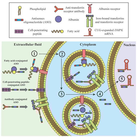 Strategies to enhance antisense oligonucleotide (ASO) intracellular delivery. ASOs may be conjugated to a fatty acid chain, enhancing its affinity to albumin and other serum proteins, to a cell-penetrating peptide (CCP), or to an anti-transferrin receptor 1 (TfR1) monoclonal antibody to promote cell uptake. (1) Conjugated ASOs are localized at the cell membrane, either because of the conjugate binding to specific cell receptors or because of interactions of the CCP with the cell membrane. (2) ASOs are then internalized in early endosomes by endocytosis. (3) An increase in pH in endosomes promotes cleavage of the ASOs’ linker and their release from the conjugates. (4) A small portion of ASOs escape the endocytic vesicles and cross the nuclear pores to the nucleus, (5) where they can target CUG-expanded RNAs.