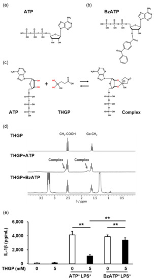The inhibitory effect of THGP on inflammasome activity is dependent on ATP. The structural formulas and structures of ATP (a) and BzATP (b) and the estimated structure of the complex formed by ATP and THGP (c). (d) Complex formation between THGP and ATP or BzATP was investigated by 1H-NMR. (e) After stimulation with a combination of LPS with ATP or BzATP, the content of IL-1β secreted from THP-1 cells was measured by ELISA. The results and S.D. are shown. The mean and S.D. are shown. n = 6. ** p < 0.01.