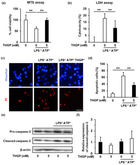 A total of 1 × 106 cells/well were seeded in a 6-well plate and cultured for 24 h in the presence of 1 μM PMA. Then, 5 mM THGP was added, and the cells were cultured for 24 h. Furthermore, 10 μg/mL LPS and THGP were added. Subsequently, ATP (1 mM) was added for 2 h. Then, the cells were stained by Propidium Iodide (Dojindo Laboratories) and Hoechst 33452 (Dojindo Laboratories). Hoechst 33452-stained cells were counted as total cells and Propidium Iodide-stained cells were counted as apoptotic cells.