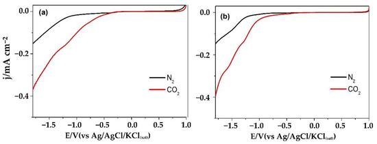 Linear sweep voltammograms taken in 0.1 M TBAF/ACN with TMO thin-film electrodes at 5 mV·s−1 scanning rate: (a) Fe2O3, (b) MoO3. The black and red curves correspond to scans under an atmosphere of N2 and CO2, respectively.