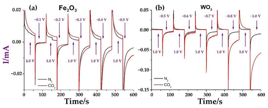 The chronoamperometric profiles shown in Figure 3 indicate the potential steps associated with each thin-film electrode. For MoO3, when the applied potential returns to Pi, the current in both CO2 and N2 purged is the same. In contrast, after electrode polarization to the initial potential from each final potential with CO2 electrode saturation, Fe2O3 shows an increase in anodic current. This could possibly be related to a reduction product reoxidation. In this sense, it is worth nothing that a wide potential peak at 0.2 V is observed, as can be seen from the cyclic voltammetry results. When a negative potential was applied under N2 and CO2 purging conditions, the currents were not always the same at the end of each step potential. For Fe2O3, an increase in current is observed from −0.3 V after 59 s under CO2 purge conditions, the increase being higher at −0.5 V. For MoO3, said increase in current becomes evident at −0.7 V.