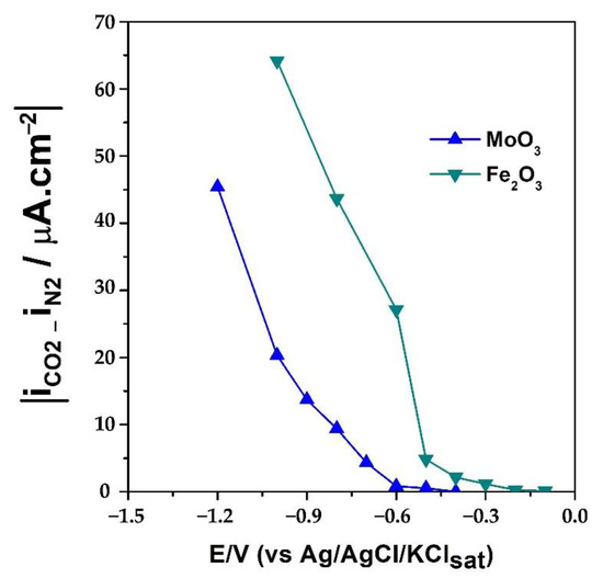 A current profile calculated using Equation (9) has an increase in the relationship between faradaic and non-faradaic currents, as shown in Figure 4. In each case, the intercept with the potential axis corresponds to the onset potential for faradaic current related with the CO2 reduction. The onset for electrodes used in this study was −0.4 V for Fe2O3, and −0.6 V for MoO3. Furthermore, Figure 4 reveals not only the decrease of the overpotential for CO2 reduction, but also the higher faradaic currents for the Fe2O3 electrode, being the best electrocatalytic electrode under the experimental conditions. It should be noted that differences in electrode interface area may vary and are desirable for proper electrode performance comparison.