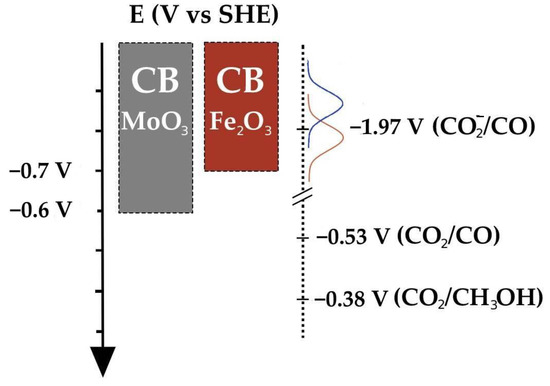 On the other hand, TMOs, such as Fe2O3 and MoO3, are n-type semiconductors, and their catalytic activity could be related to the conduction band position [32]. The conduction band position could estimate if the electron transfer is thermodynamically feasible. Although several conduction and valence band position diagrams are found in literature for the thin film electrodes studied, these values correspond to conditions different from those applied in this study, and are generally under vacuum conditions [33]. However, the potential at which the conduction band is found depends on factors such as the type of oxide, charge state of the surface, presence of adsorbed species, pH, and isoelectric point of the material [34]. In this way, the flat band potential was estimated via photoelectrochemical measurements in the presence of low oxidation potential species such as methanol [35]. This potential should be very close to the potential of the conduction band lower edge, and related with the apparition of photocurrents. Figure S5 in Supporting Information shows the LSV profile for Fe2O3 and MoO3 electrodes under transitory illumination, in 0.1 M de TBAF/ACN/+3.0 M CH3OH, purged with N2. The results show that photocurrent onset potentials start at −0.70 V for Fe2O3, and 0.65 V for MoO3. Therefore, the electron transference from the TMO to CO2 molecule and the formation of thermodynamically favored C1 products from CO2 reduction are feasible. Scheme 1 represents the conduction band position for TMO under the conditions of this study, and the potentials (versus SHE at pH 7) for some relevant CO2 redox couples (Scheme 1).