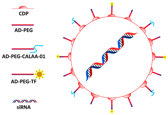 CALAA-01 structure: The system is composed by a core of cyclodestrin encapsulating the siRNA and functionalized with PEG bearing adamantine (AD-PEG) and transferrin (AD-PEG-TF). Figure from Kurreck et al. [72].