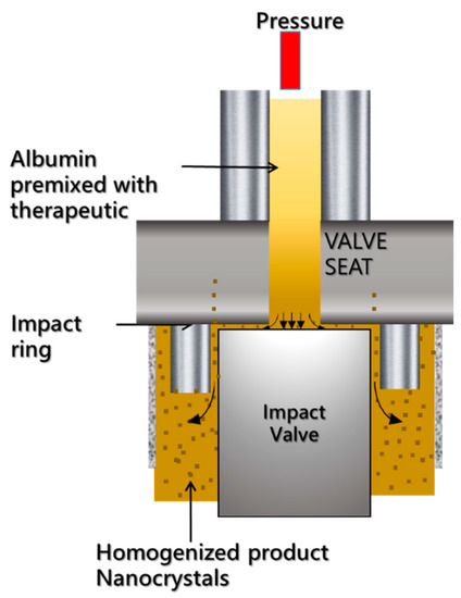 ABI 007, nanoparticle albumin-bound (Nab) PTX, Abraxane are all names used to identify albumin nanocarriers loaded with PTX, to avoid the use of Cremophor-EL [124]. Abraxane allowed for PTX encapsulation, exploiting the natural ability of Albumin to interact with hydrophobic drugs at multiple sites of its structure [124]. The interactions between albumin and drug are solely hydrophobic without formation of covalent bounds, even though some low-degree of crosslinking that can occur between the albumin molecules on the surface of the nanoparticles [124]. The nanocomplexes have an average size diameter of 130 nm and the energy to generate the hydrophobic interactions is provided by the synthetic route, based on high-pressure homogenization where drug and albumin molecules are mixed in an aqueous solution and pushed (under high pressure) in the narrow spaces of the homogenizer (Figure 3) [125].