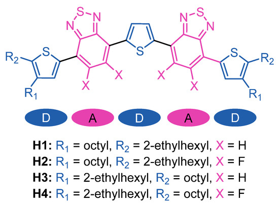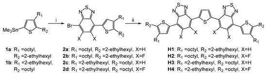 The syntheses of the materials H1-4 are presented in Figure 2. In brief, compounds 2a-b were prepared via the palladium-catalyzed Stille cross-coupling reaction between 4,7-dibromobenzo[c]-1,2,5-thiadiazole or 5,6-difluoro-4,7-dibromobenzo[c]-1,2,5-thiadiazole and stannanes 1a-b. Mono-functionalized products 1a-d were isolated, purified, and used for the synthesis of the target compounds via the Stille reaction using 2,5-bis(tributylstannyl)thiophene. All compounds exhibited good solubility in common organic solvents, such as dichloromethane, chloroform, and toluene, which enables their deposition in multi-layered organic electronic devices from solutions.